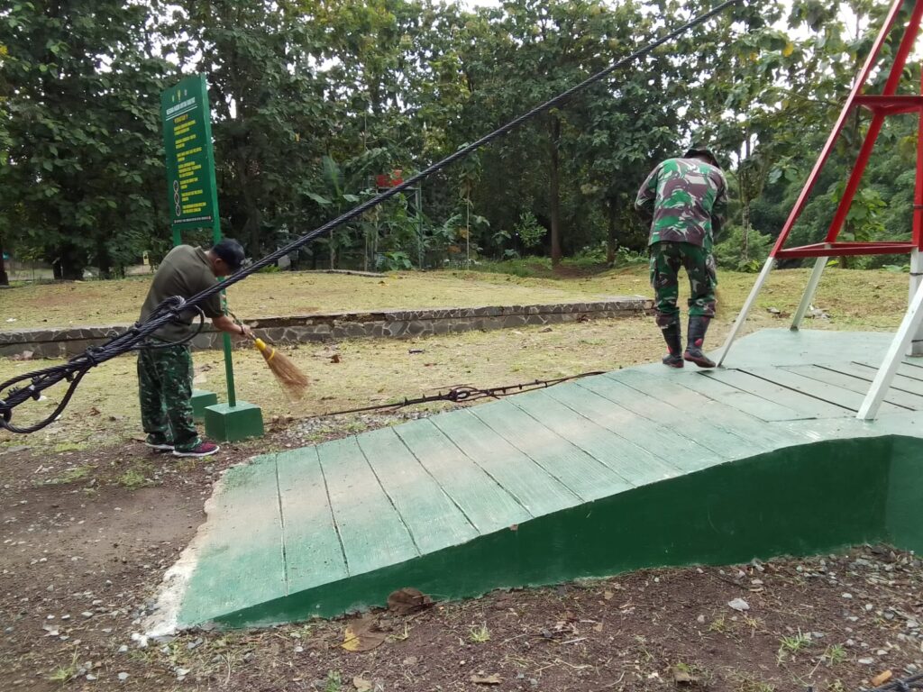 Cirebon – Danramil 0620-19/Arjawinangun Kapten Kav Tarjo bersama anggota melaksanakan kegiatan Bakti Almamater (Korfe) dalam rangka launching Jembatan Gantung Babakan Ciwaringin yang berlokasi di Desa Ciwaringin, Kecamatan Ciwaringin, Kabupaten Cirebon, Minggu (8/3/2026).