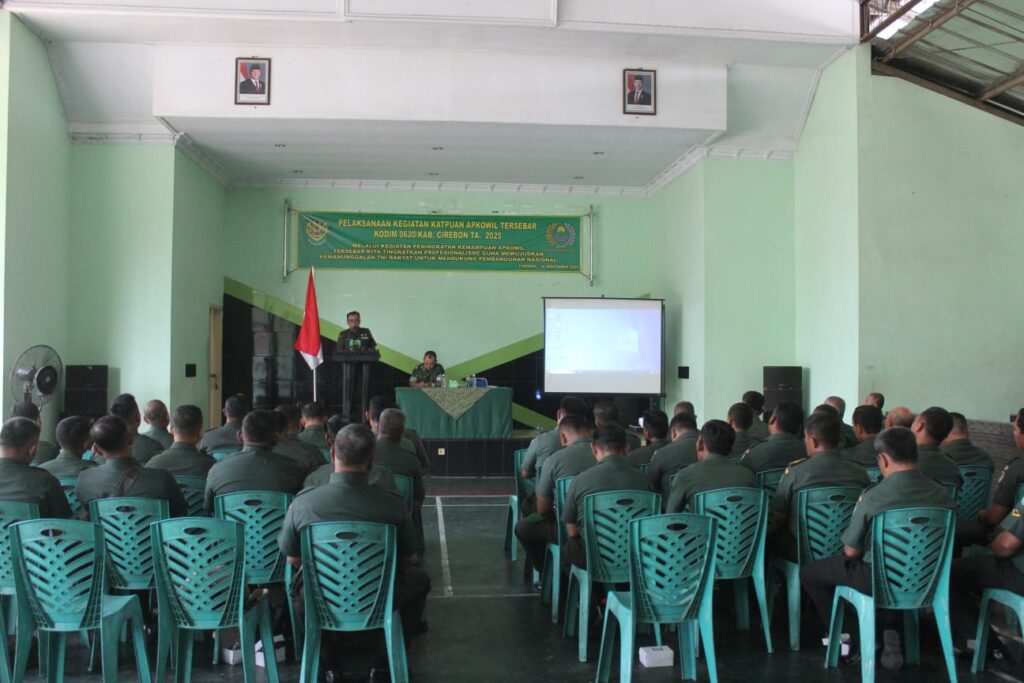 Cirebon, 19 November 2025 – Kodim 0620/Kabupaten Cirebon melaksanakan kegiatan Peningkatan Kemampuan Aparat Komando Kewilayahan (Katpuan Apkowil) Terbesar TA. 2025 bertempat di Aula GSG Jati Manunggal Kodim 0620/Kab. Cirebon, Jl. Fatahillah, Kelurahan Perbutulan, Kecamatan Sumber, Kabupaten Cirebon. Kegiatan yang dimulai pukul 08.30 WIB dan diikuti sekitar 50 peserta ini bertujuan untuk meningkatkan profesionalisme prajurit kewilayahan sebagai upaya memperkuat kemanunggalan TNI dengan rakyat dalam mendukung pembangunan nasional.